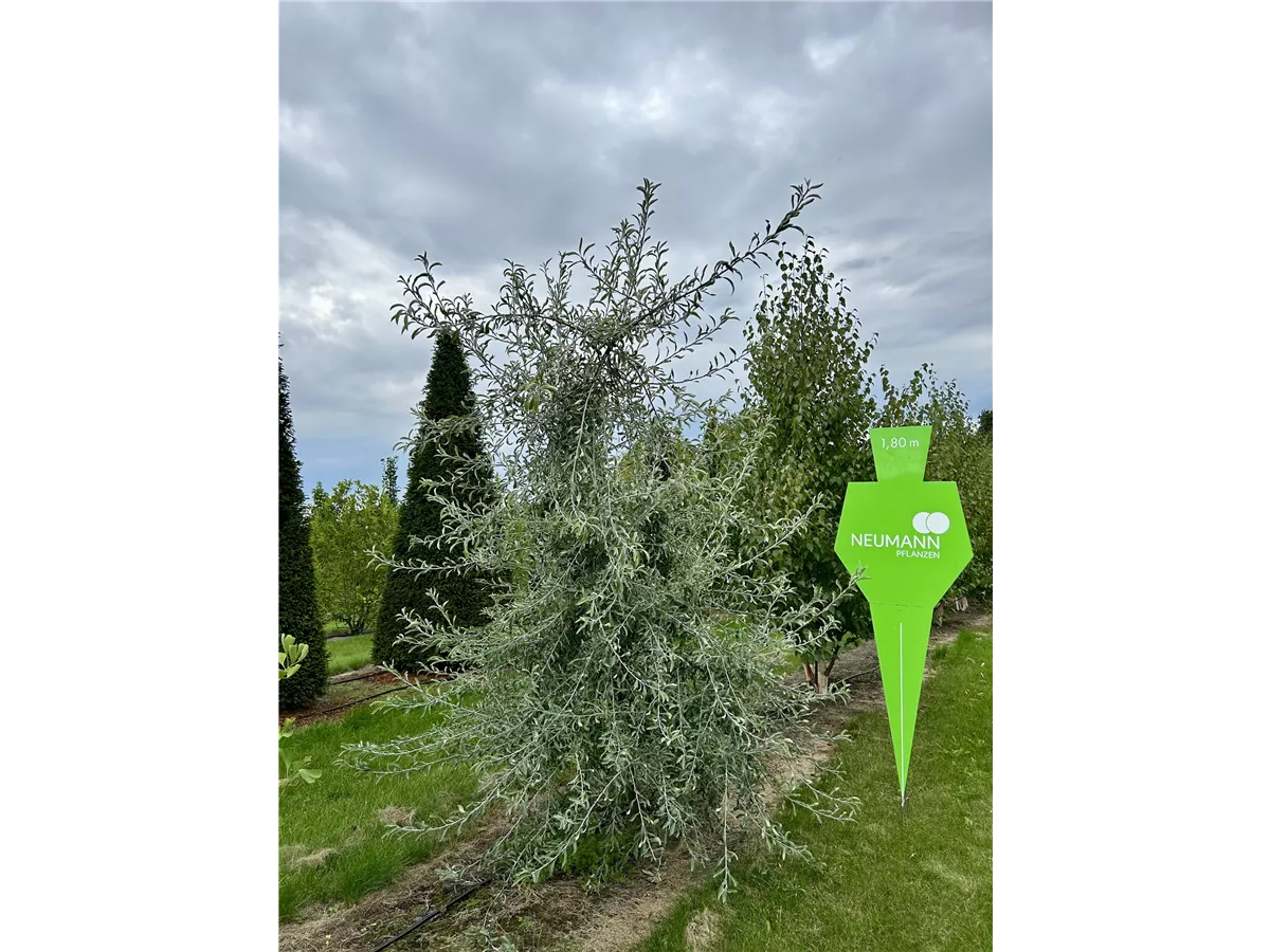 Die Hängende Wildbirne 'Pendula' (Pyrus salicifolia) ist ein hängender, malerischer Kleinbaum mit dekorativen, grünen, birnenförmigen Früchten. Diesen voraus bringt sie von April bis Mai weiße, in Doldentrauben angeordnete Blüten hervor. Zudem trägt die Hängende Wildbirne 'Pendula', matte, lanzettliche, silbergraue Blätter. An einem sonnigen Standort mit durchlässigem, nährstoffreichem Boden erreicht sie gewöhnlich eine Höhe von ca. 7 m und wird ca. 4 m breit.