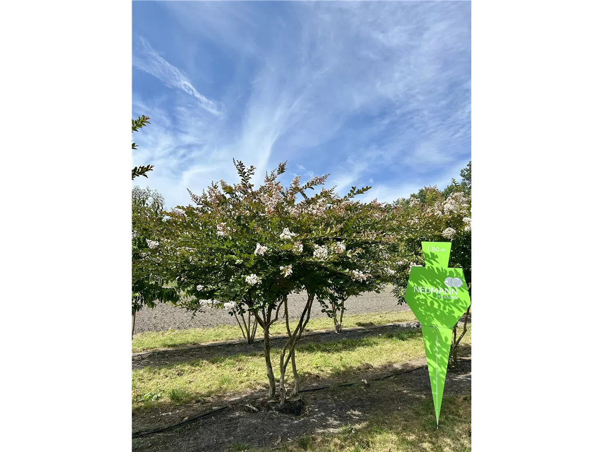 Die Lagerströmie 'Natchez' (Lagerstroemia indica) ist eine sehr beliebte, sommergrüne Kübelpflanze. Ihre weißen Blüten erscheinen von Juli bis September. Der Standort sollte möglichst sonnig und geschützt sein. Eine durchlässige und nährstoffreiche Erde ist dabei ideal. Bei günstigen Bedingungen erreicht die Lagerströmie 'Natchez' eine Höhe von ca. 5 m und wird bis zu 5 m breit.