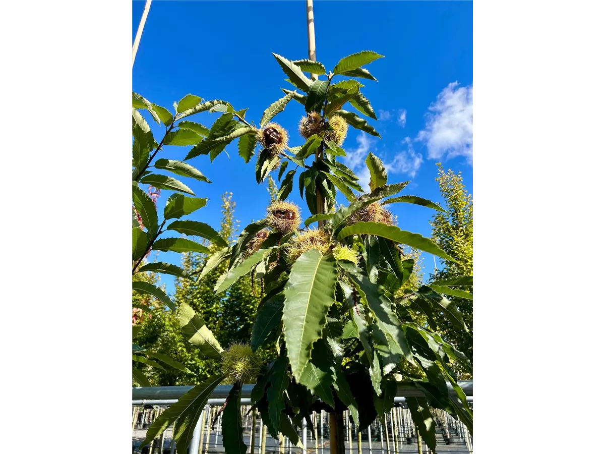 Castanea sativa bildet braune Früchte mit einem mehligen Geschmack. Die Fruchtschale ist stachelig. Reifezeit ab Oktober.