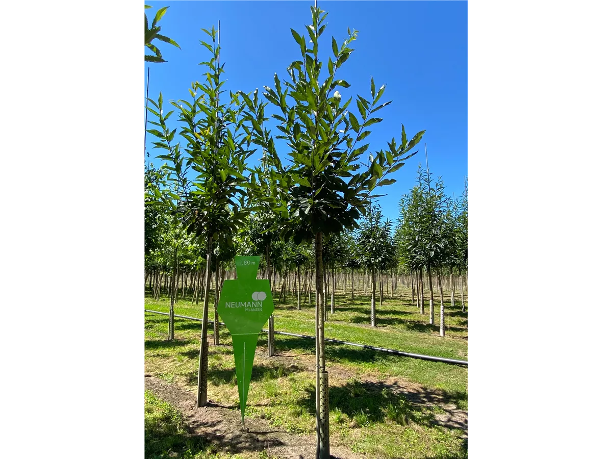 Die sommergrünen Blätter der Esskastanie sind dunkelgrün, lanzettlich, glänzend, wechselständig, gesägt. Esskastanie zeigt sich leuchtend goldgelb im Herbst.